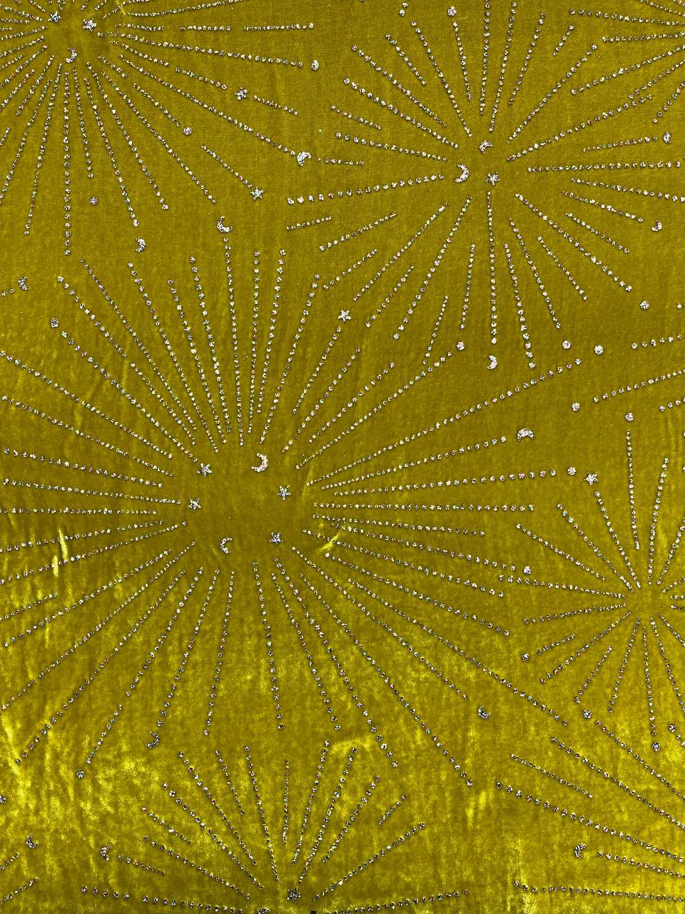 Драпируется в мягкие вислые складки. Практически не заминается. Бархат красиво переливается, ворс короткий. Рисунок выполнен разноцветным глиттером.