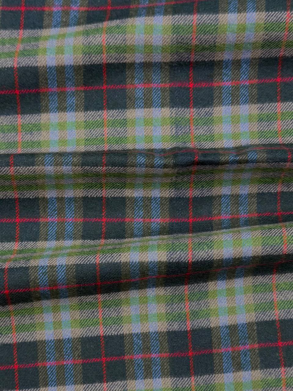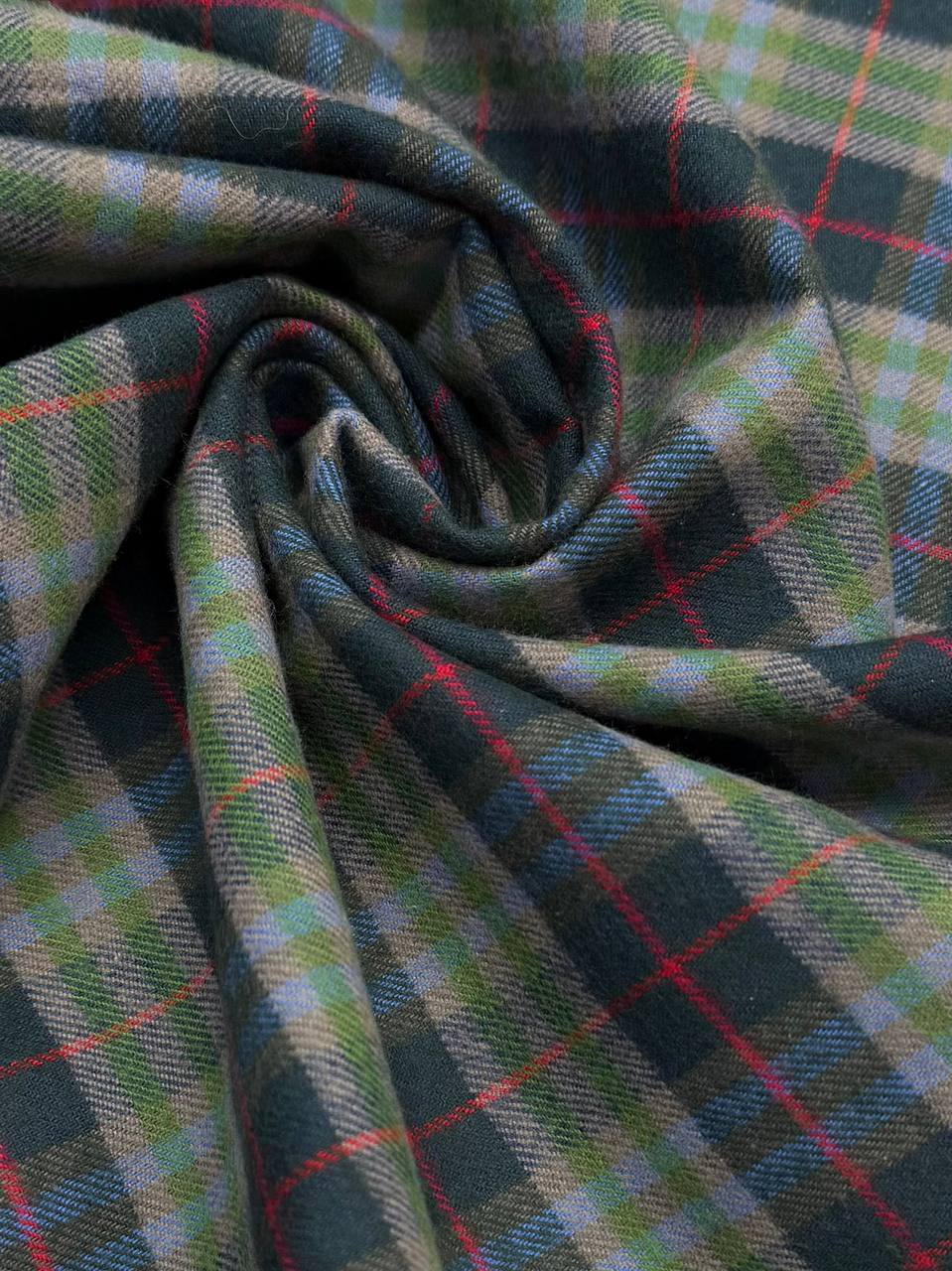 Приятное приглушенное сочетание цветов: зеленого, голубого и красного. Клетка 5,5см*5см. Средней плотности. Драпируется в небольшие складки, которые немного держат форму, благодаря плотности полотна.