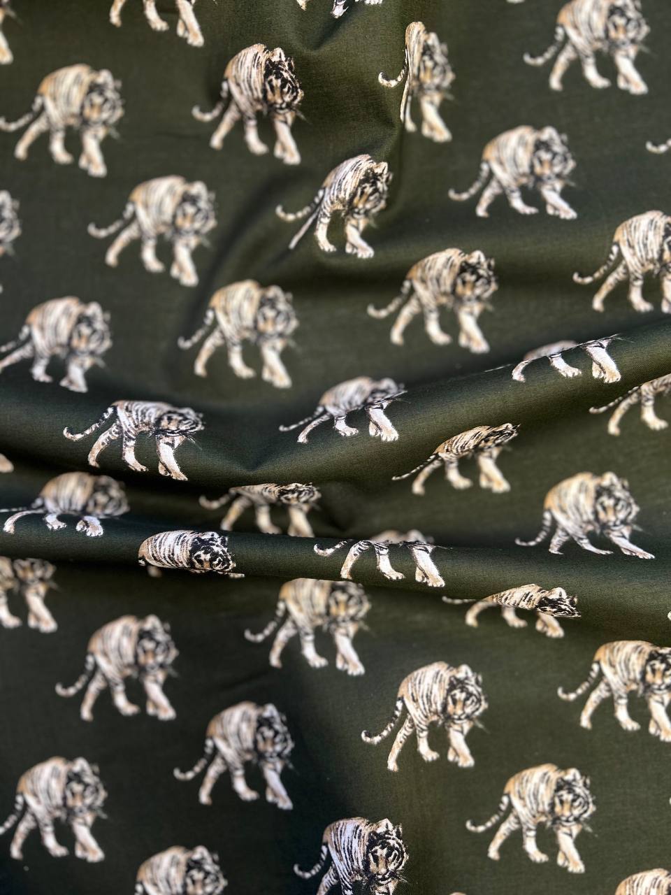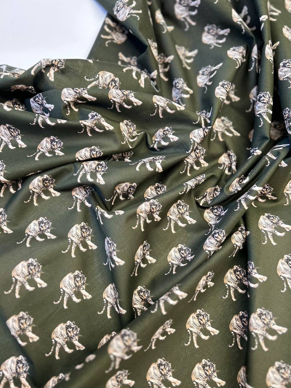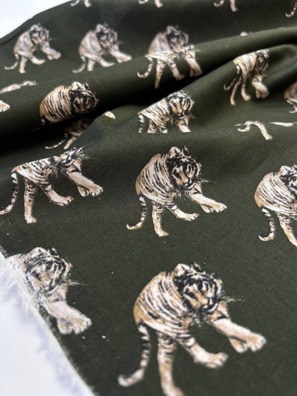 Приятный цвет как основа-хаки, оригинальный принт с тиграми.