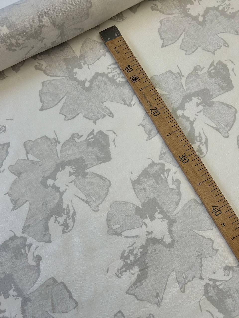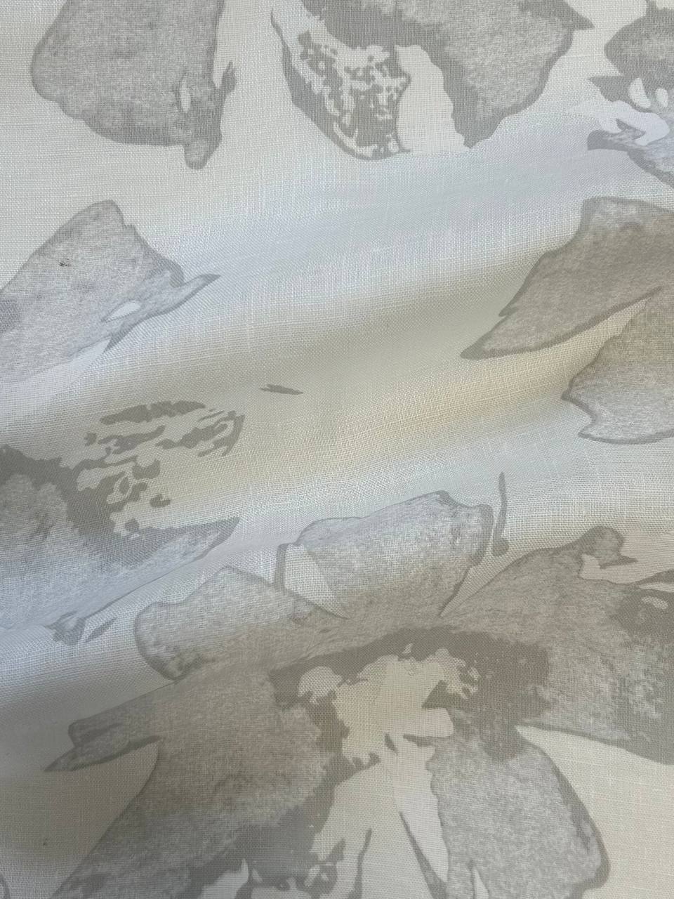 Белый лен с цветочным принтом серо-бежевого цвета.