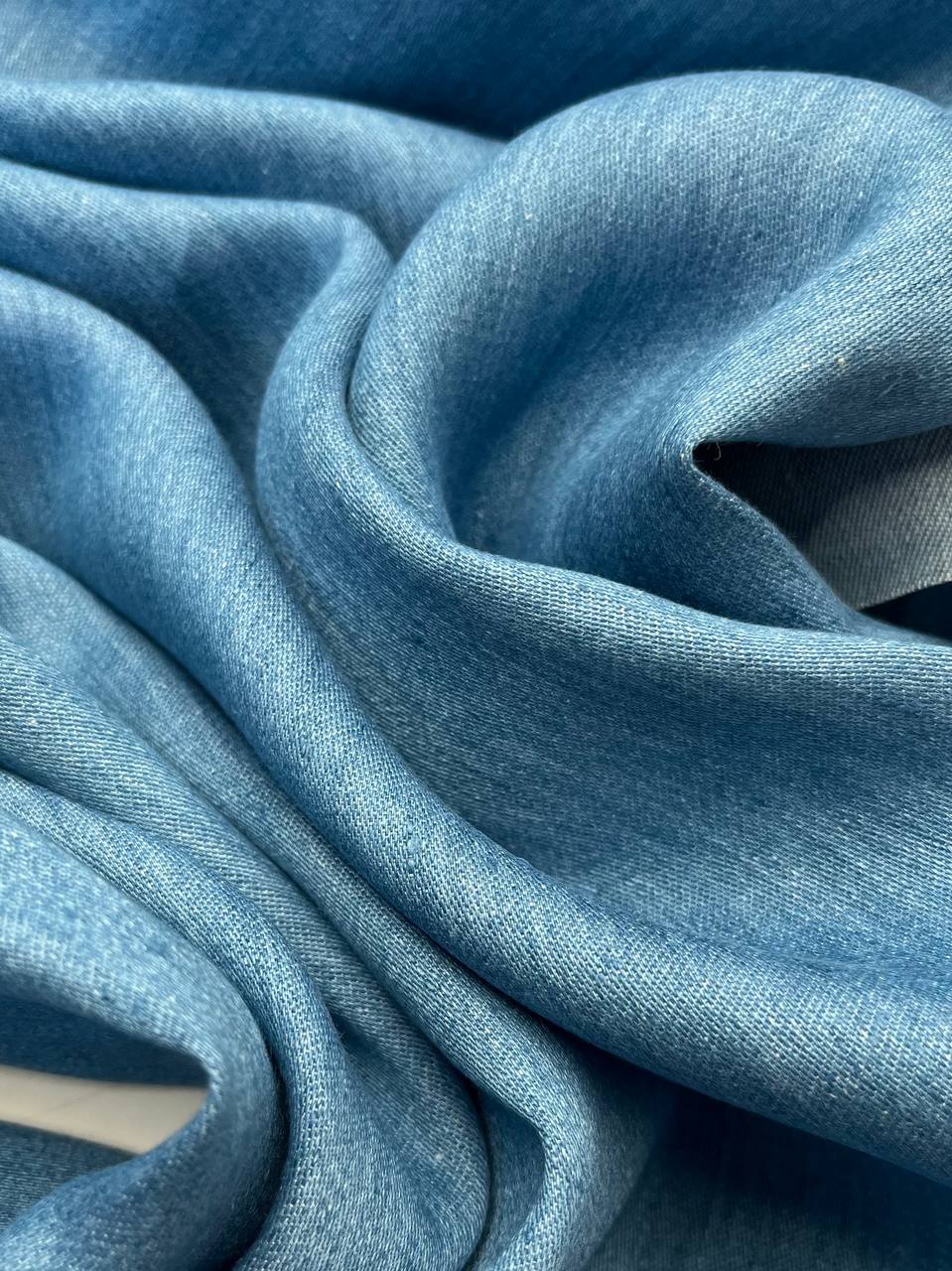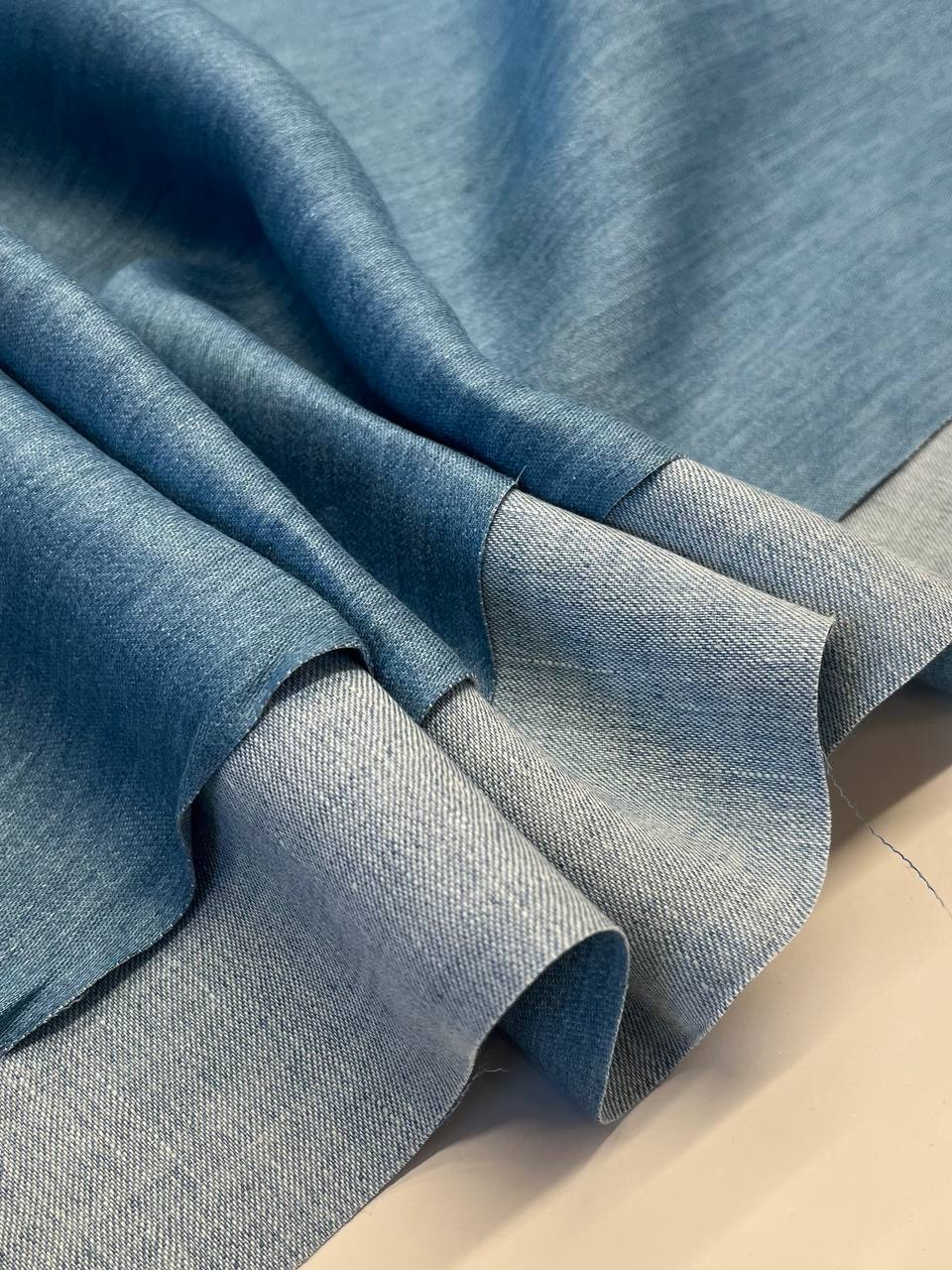 Костюмно-плательная плотность, не просвечивает. Драпируется в складки небольшого объема, заминается. Лен пластичный, не рыхлый. Обладает роскошным жемчужным лоском. Изнаночная сторона светлее, ее можно использовать в качестве отделки.