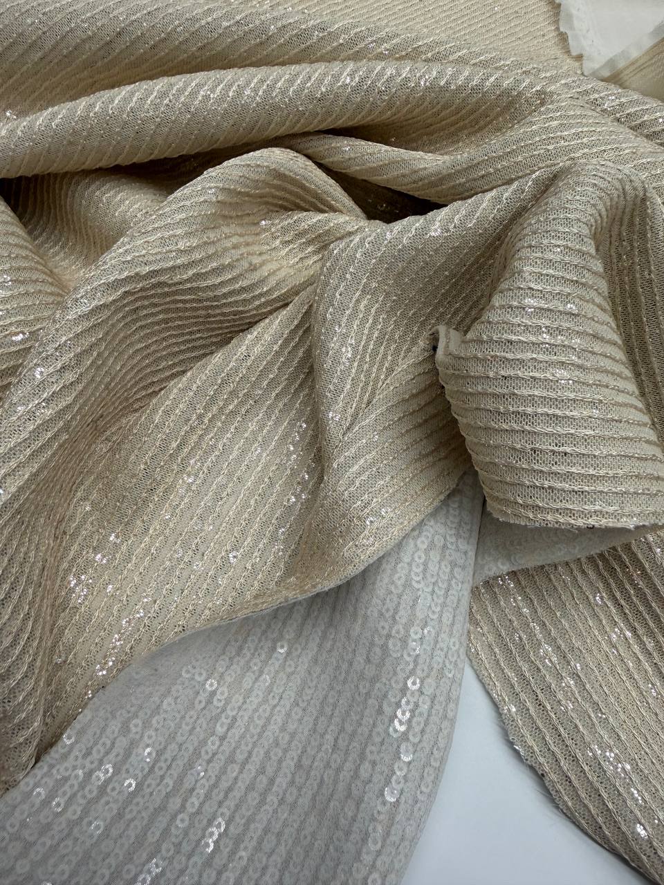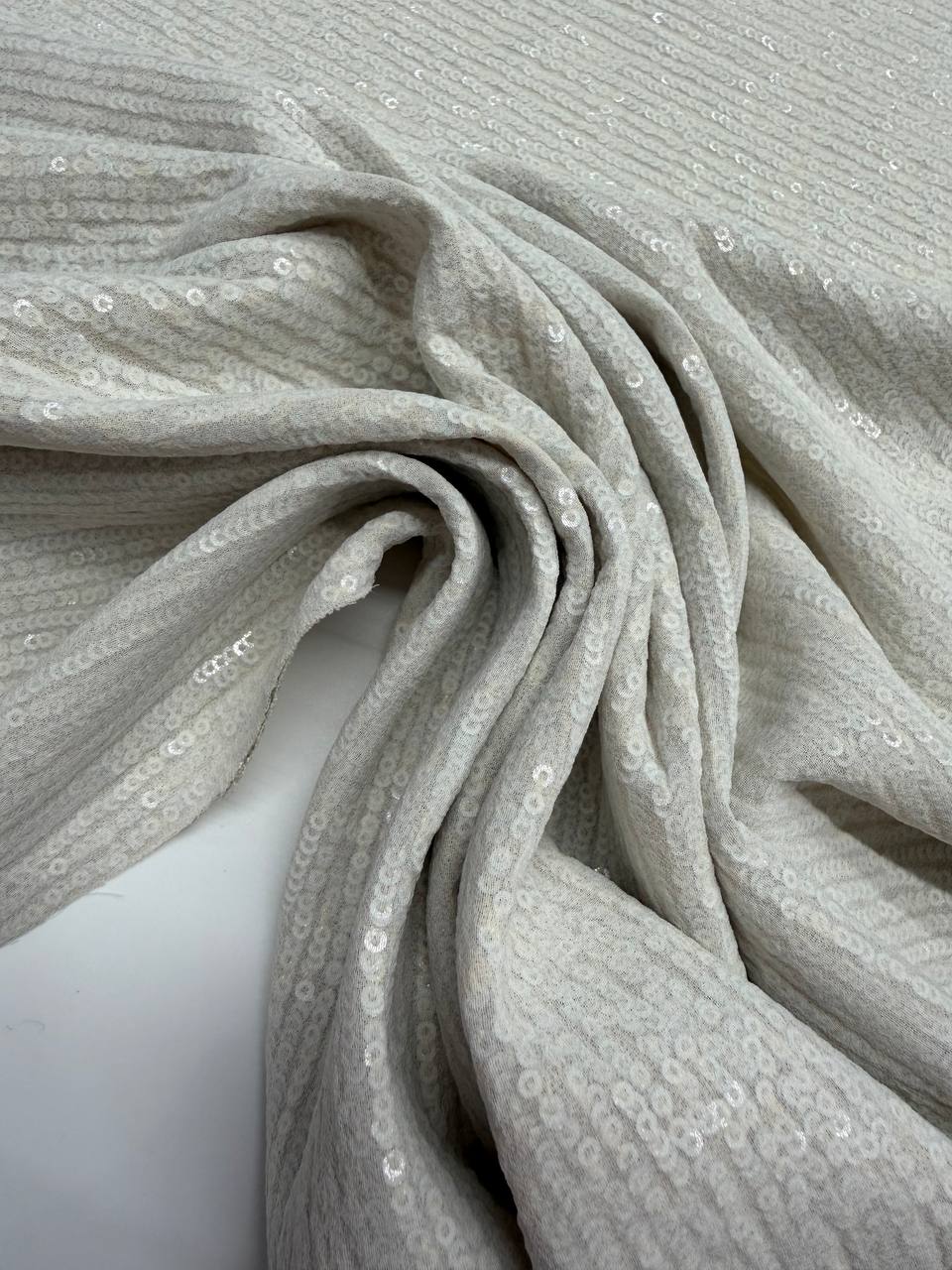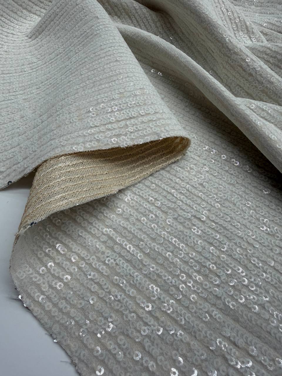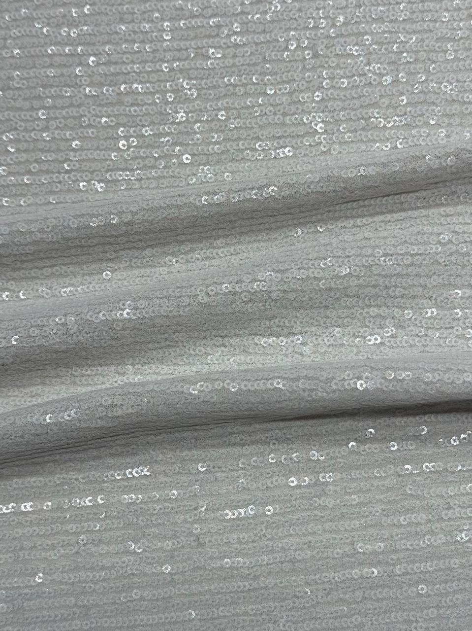 Тонкая сетка поверх серебряных пайеток делает лоск деликатным и интригующим. Не жесткая, сохраняет пластику и собирается в небольшие складки.