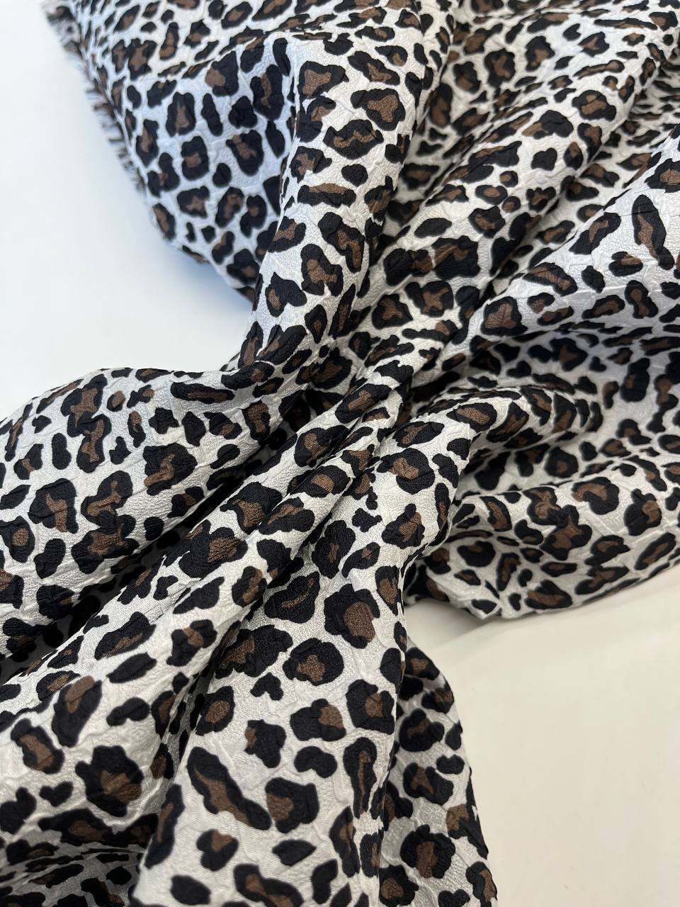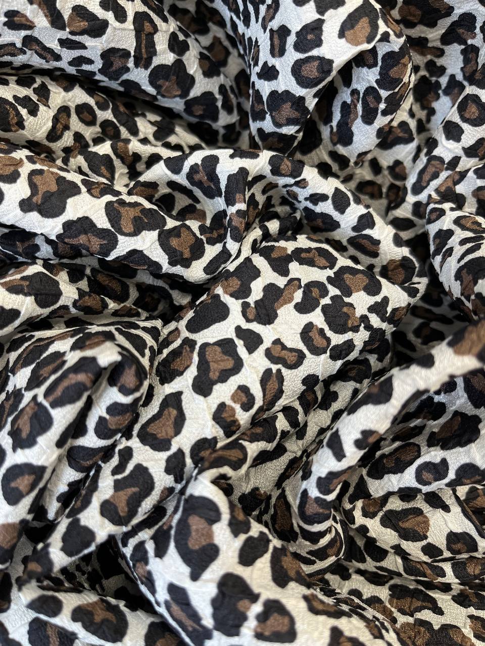 Драпируется в складки среднего объема. Не заминается и не просвечивает. Матовый финиш. Мелкий леопардовый принт в классическом исполнении.