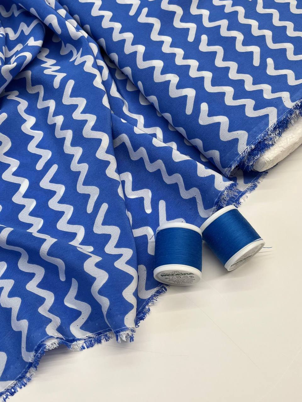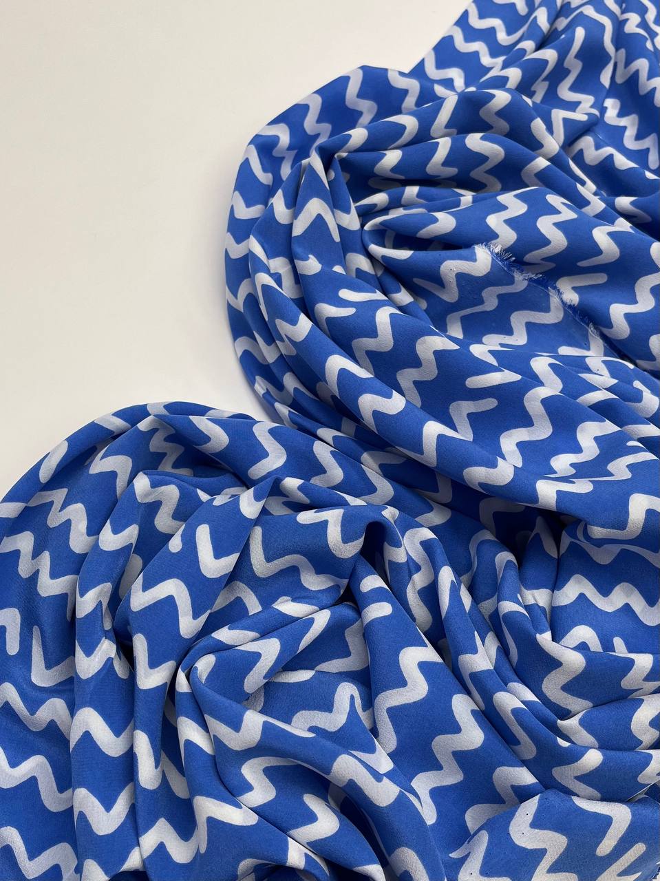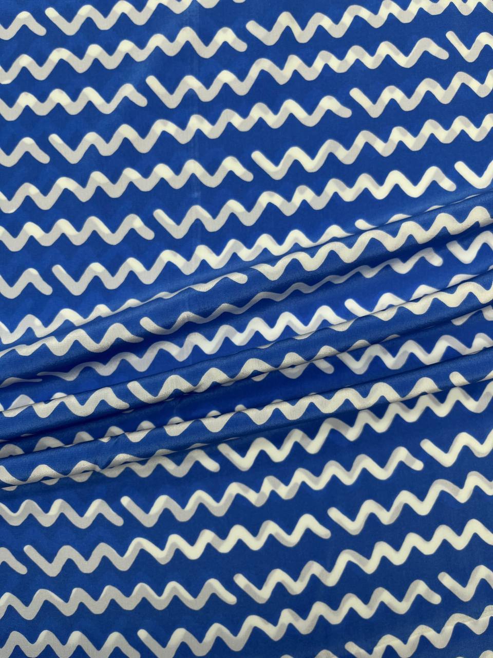 Шелк легкий и воздушный. Драпируется в небольшие мягкие складки, не заминается. Практически не просвечивает. Приятный на ощупь. Имеет матовый финиш. Принт располагается поперек. Высота волны 1,5 см.