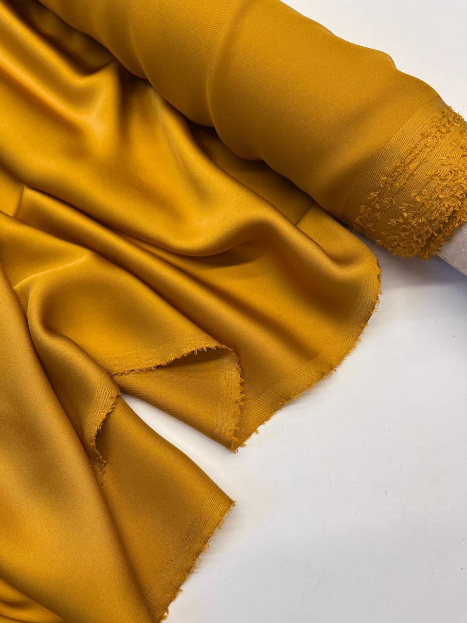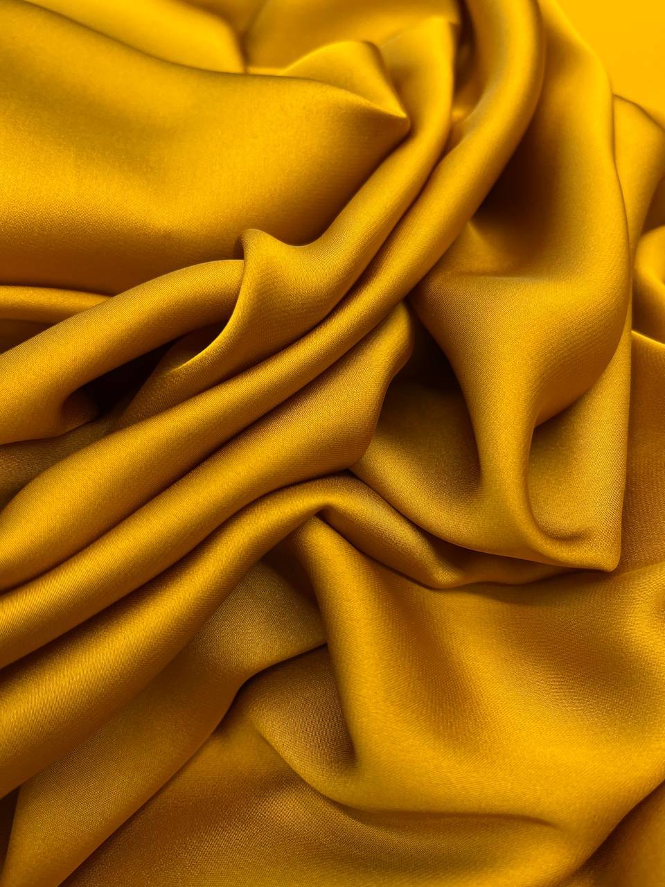 Атласное переплетение. Шелк тонкий и легкий, не просвечивает. Драпируется в мягкие складки, слегка заминается. Обладает шикарным лоском.