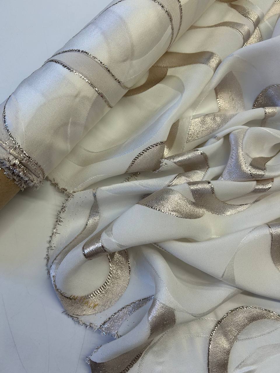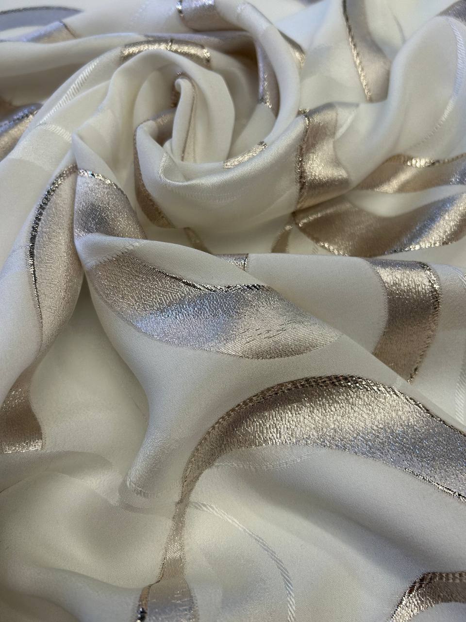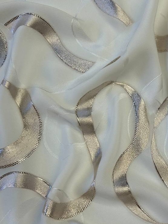 Жаккардовый шелк с серебряными линиями. Немного просвечивает и завораживающе струится.