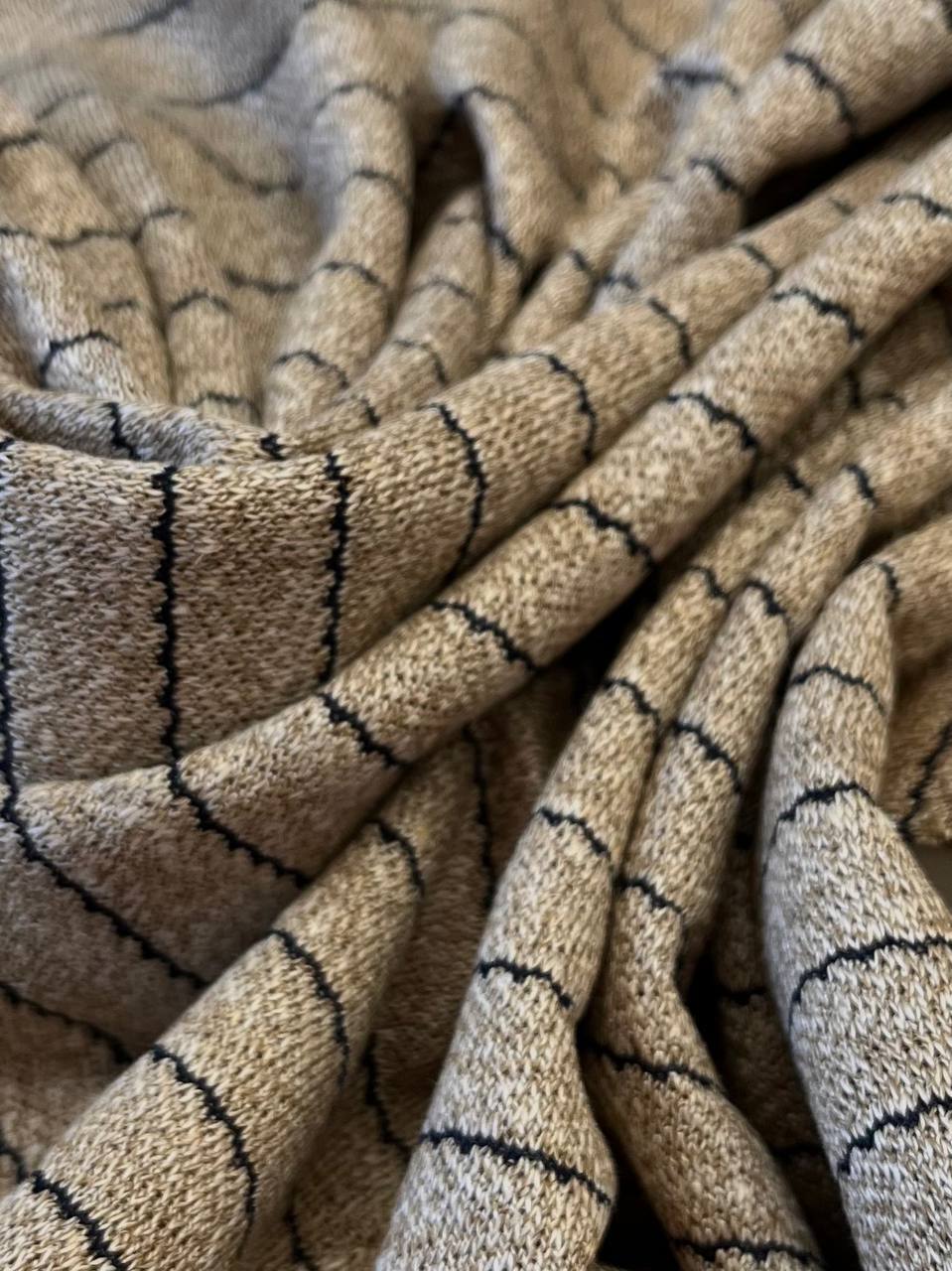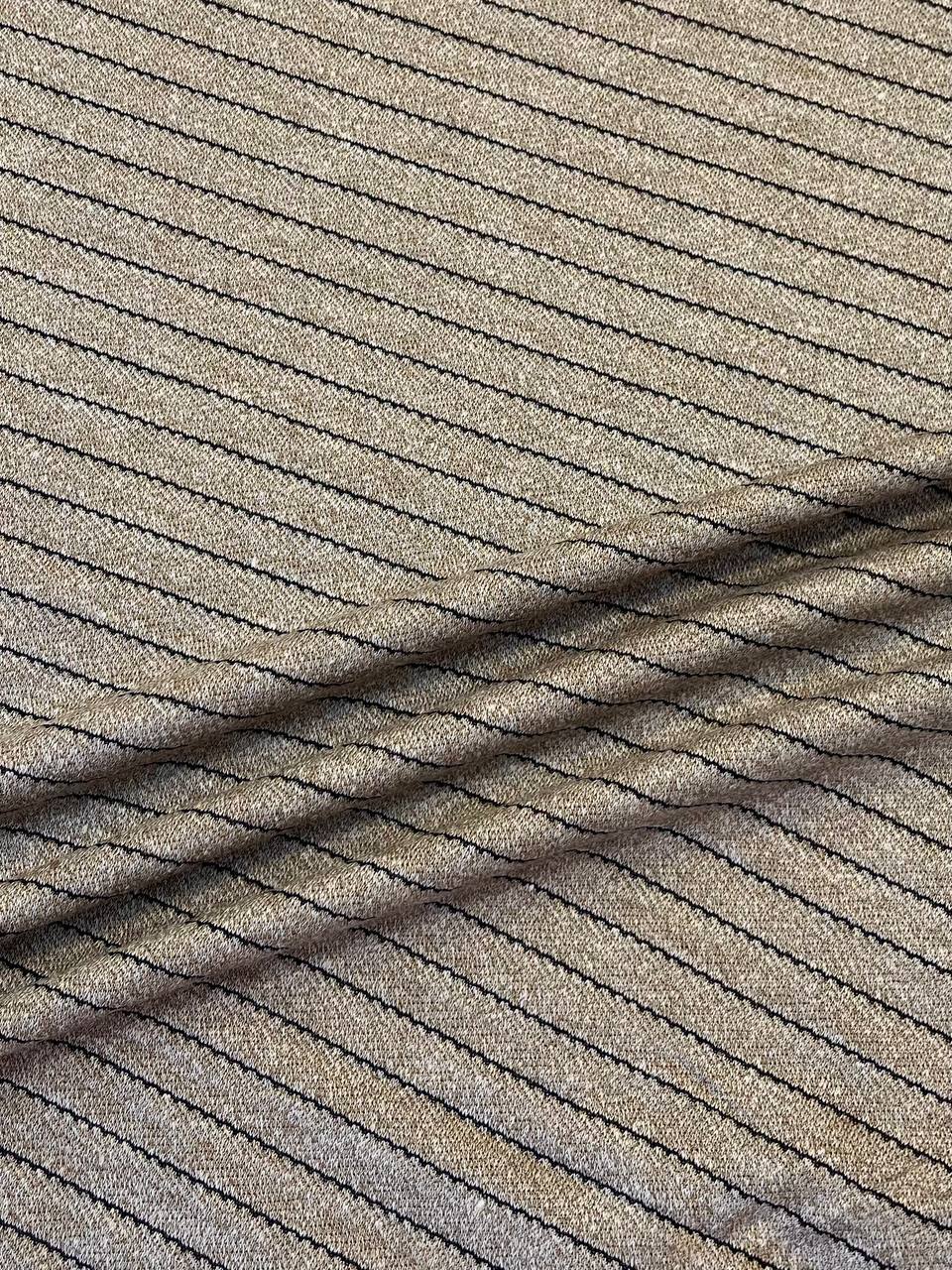 Трикотаж золотисто-бежевый от фабрики Dondi в тонкую синюю полоску