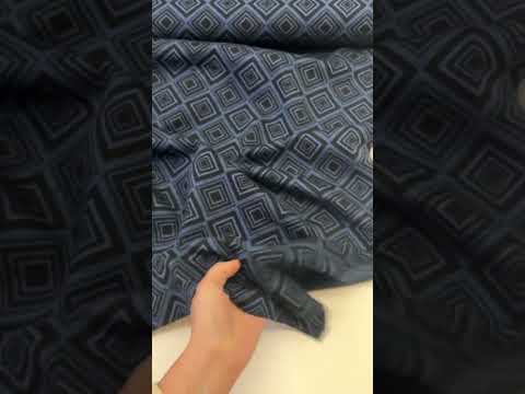 Черно-синие ромбы примерно 6 см в длину. Средней плотности. Подойдет на свитшоты, лонгсливов, трикотажные костюмы и платья.
