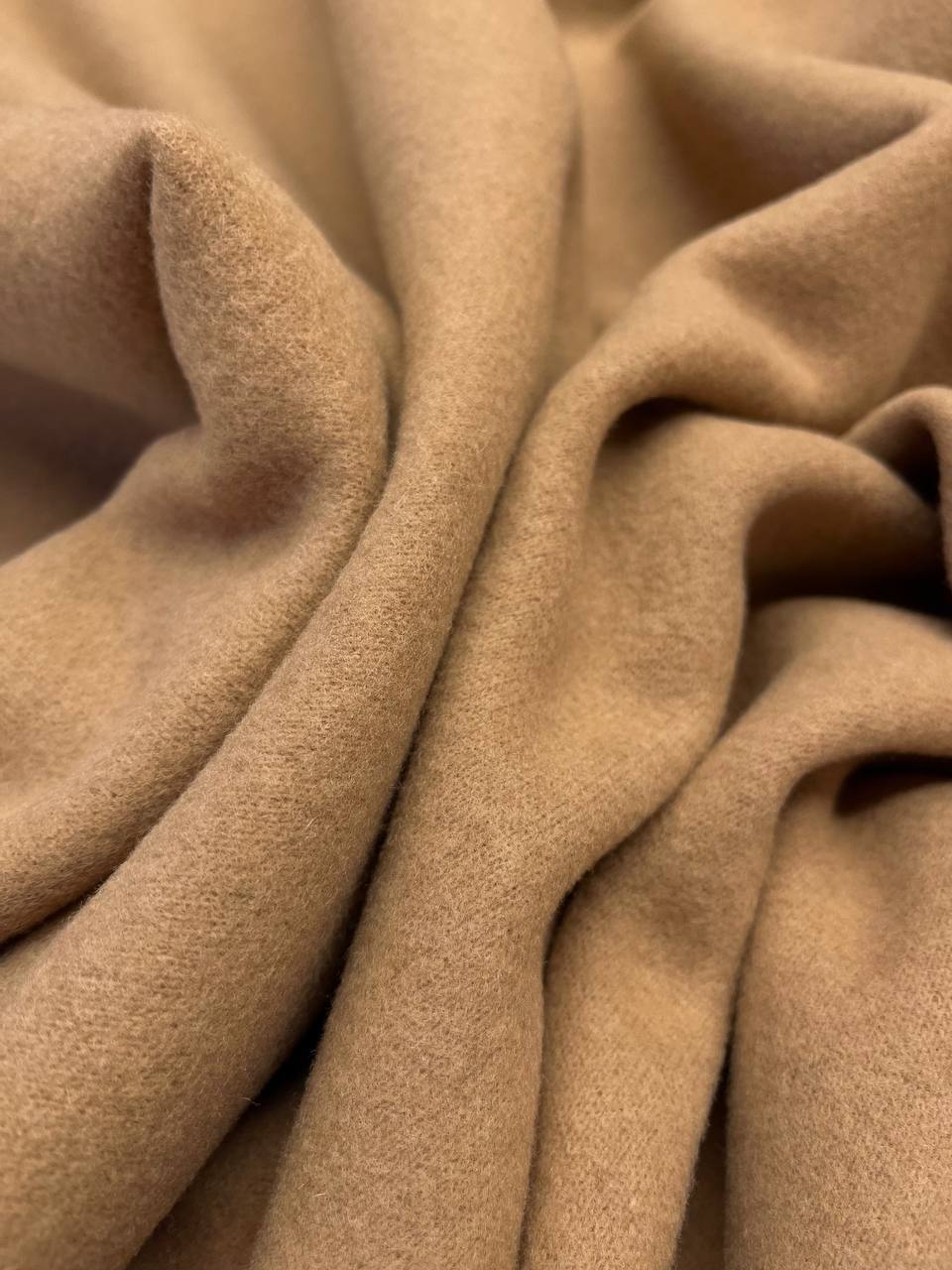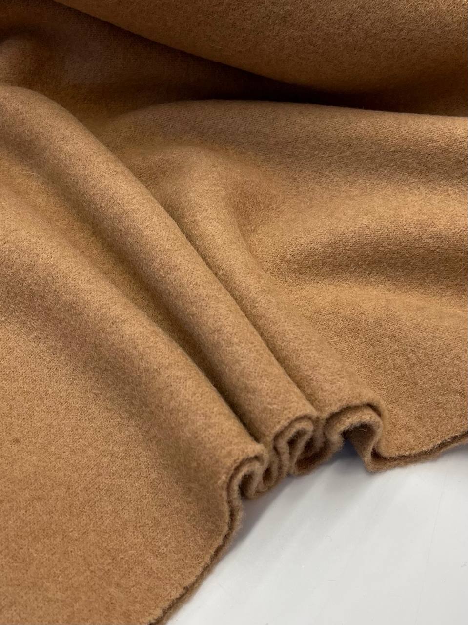Теплый и уютный, плотный трикотаж. Драпируется в мягкие объемные складки, хорошо держит форму. Немного заминается. Трикотаж можно разделить на слои. Комфортный на ощупь.