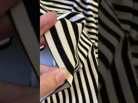 Полотно плательно-костюмной плотности, с акцентными золотыми полосками люрекса, которая освежает уже базовый черно-белый вариант , не просвечивает, не заминается, умеренно тянется во всех направлениях