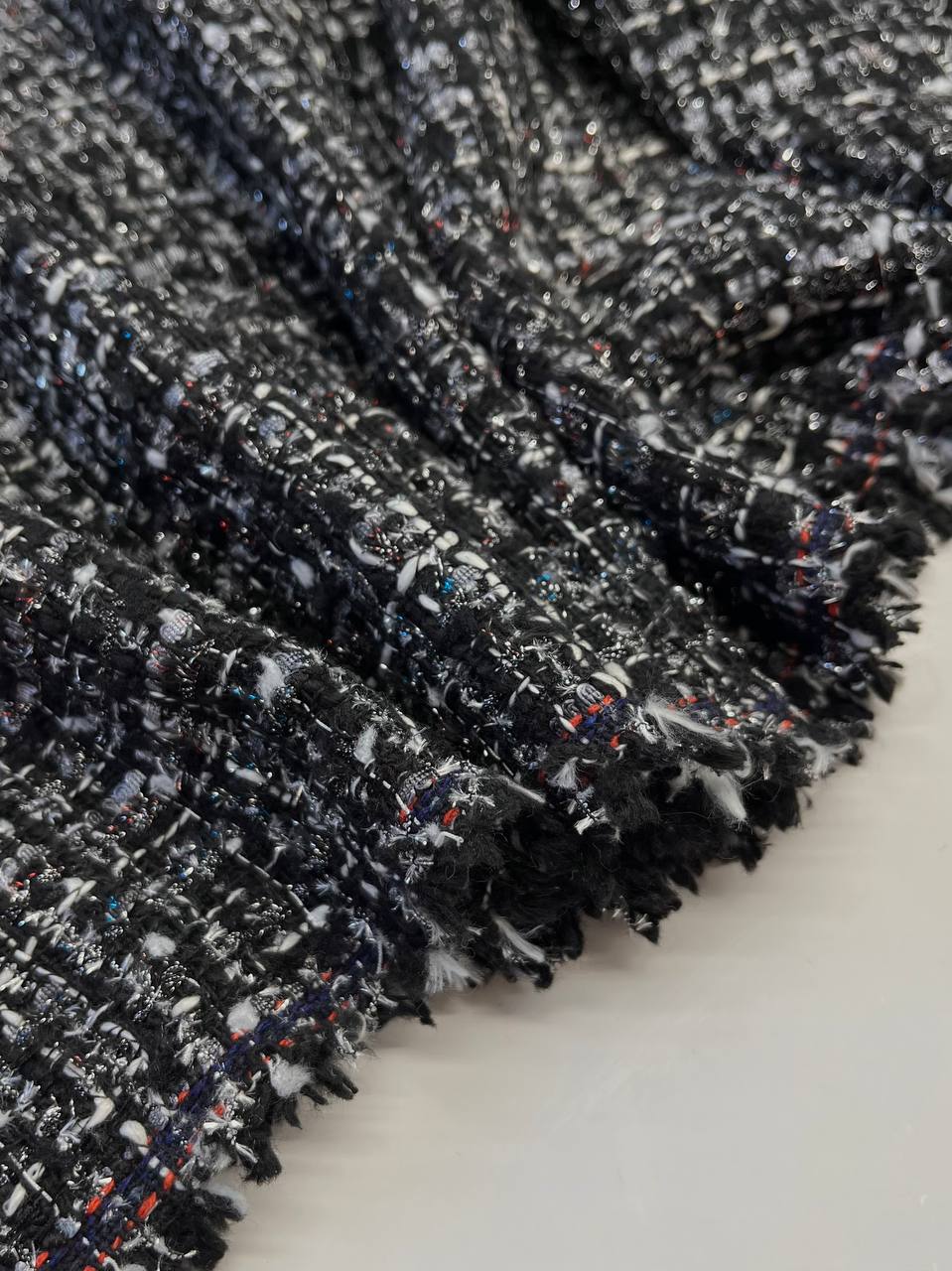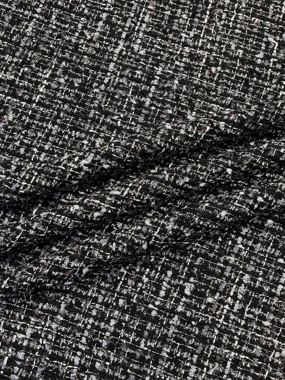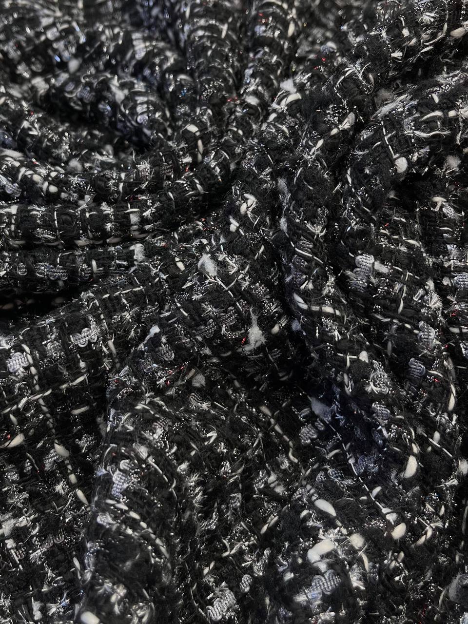 Твид Chanel в монохромном сочетании оттенков с вплетением серебристого и красного, синего люрекса